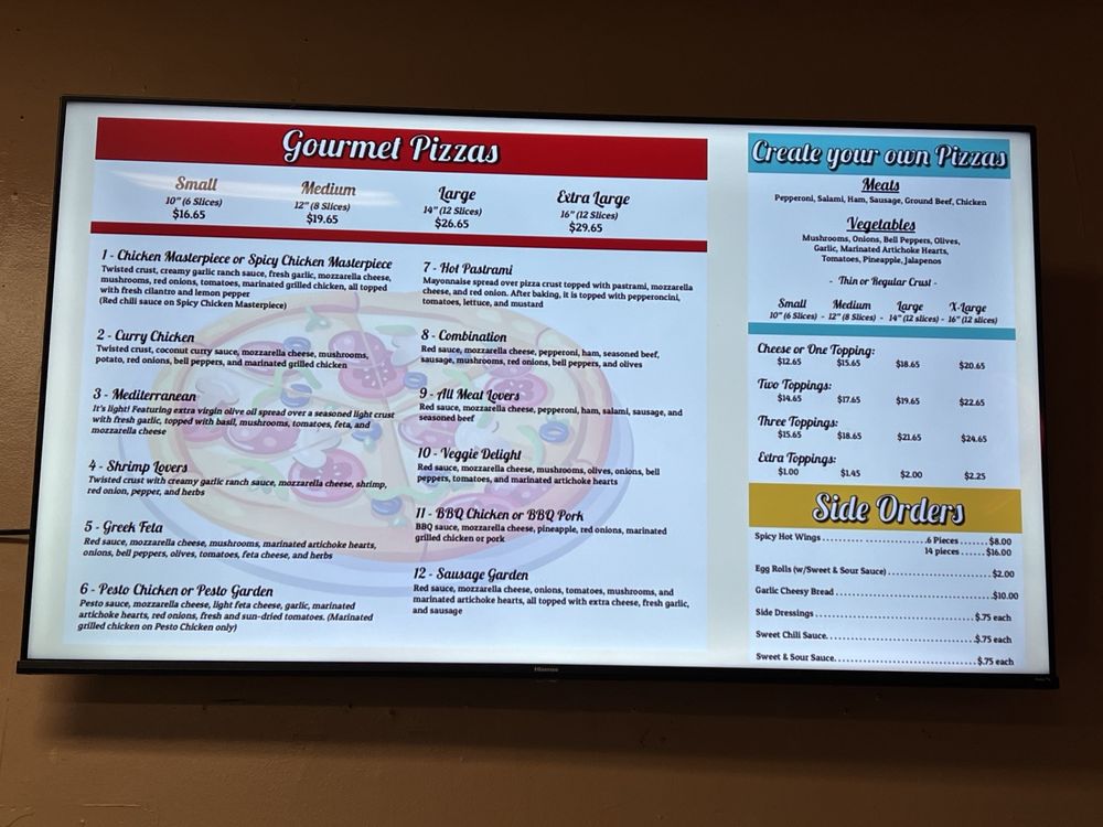 Mayonnaise spread over our pizza crust, pastrami, mozzarella cheese and red onions. After baking it is topped with pepperoncini, tomatoes, lettuce and mustard.